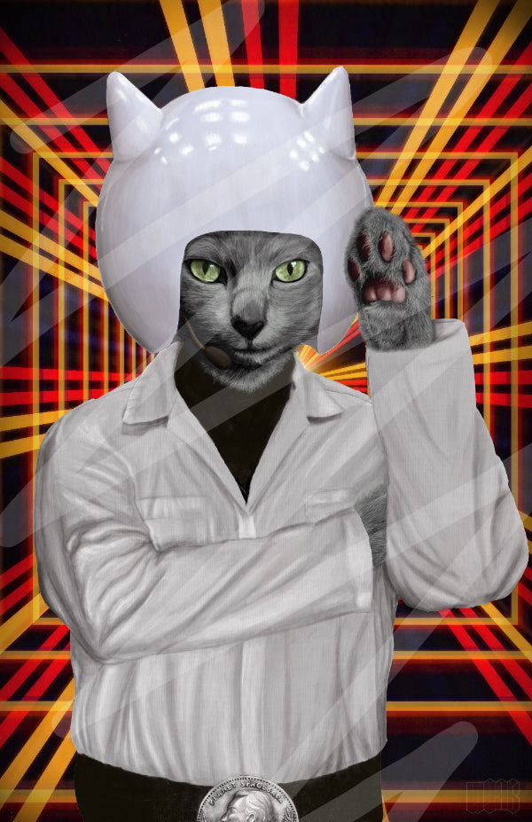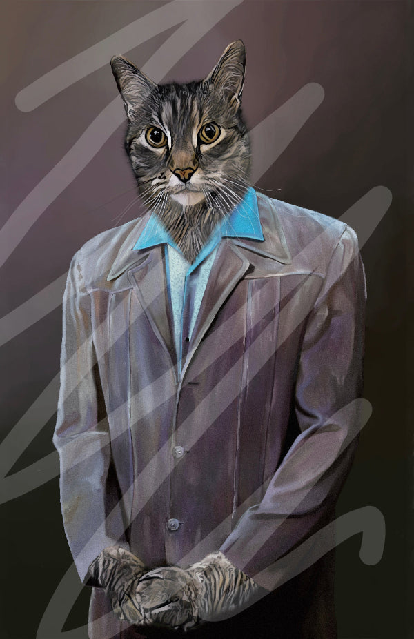 Commissioned portrait of a cat in the style of The Kramer from Seinfeld.